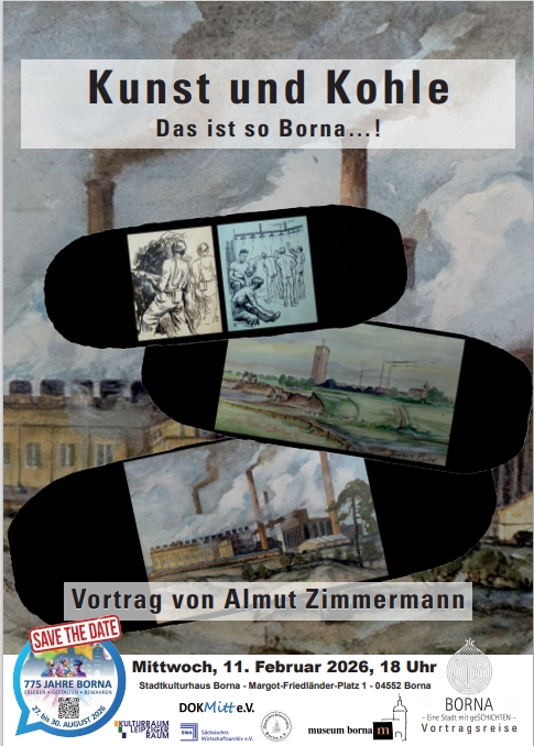 Im Rahmen des Stadtjubiläums zum Vortrag mit Almut Zimmermann unter dem Titel Kunst & Kohle - Das ist so Borna…! in das Stadtkulturhaus Borna herzlich ein.